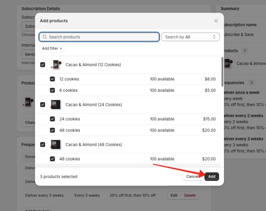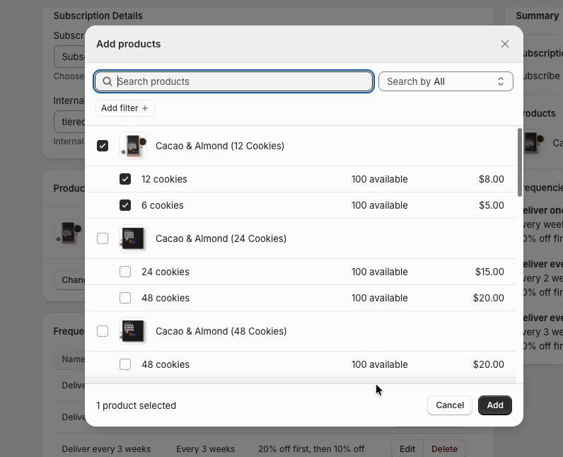 - In the Product popup, deslect the product you would like to remove and select the new product you'd like to substitute
