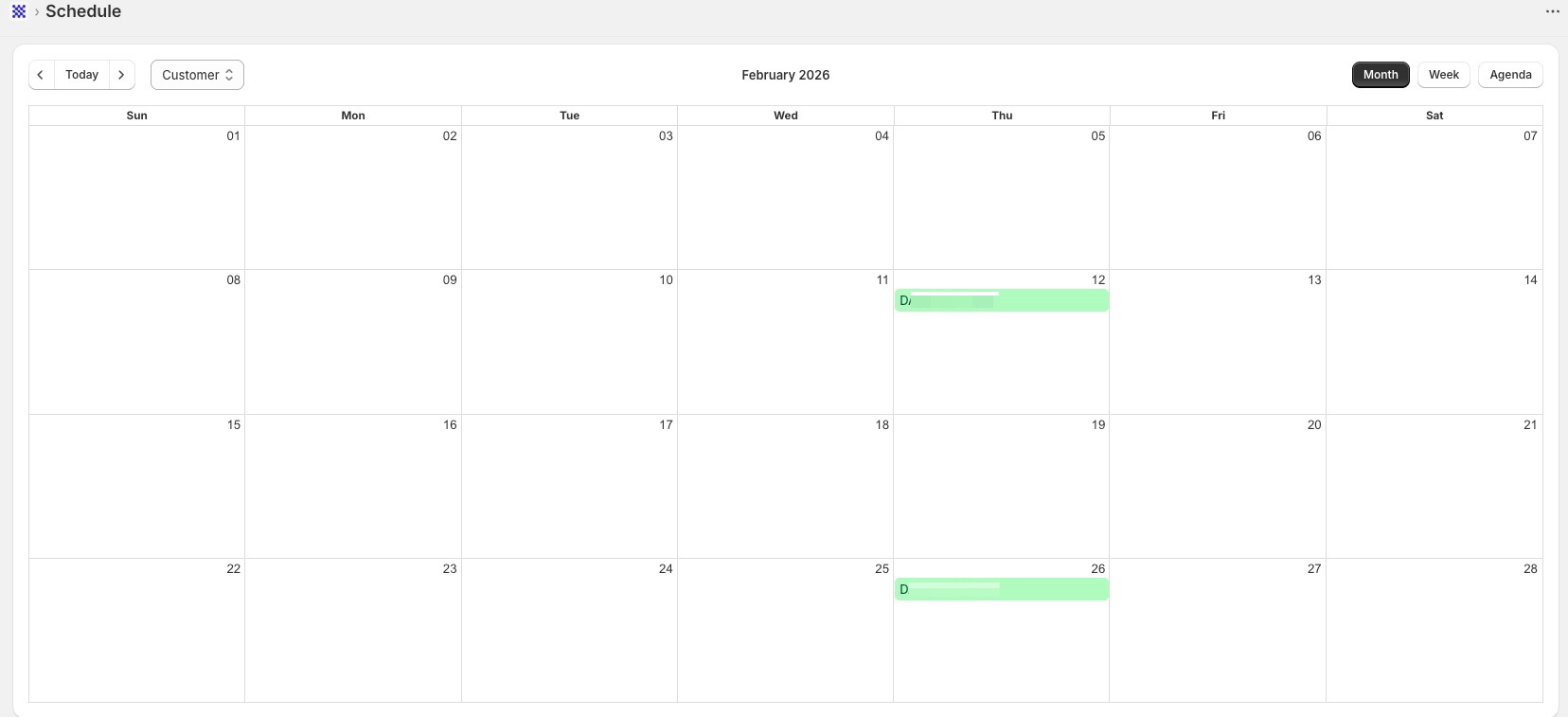 If there are no renewals in the selected view or date range, the calendar will appear empty — events will populate automatically as renewals are scheduled.