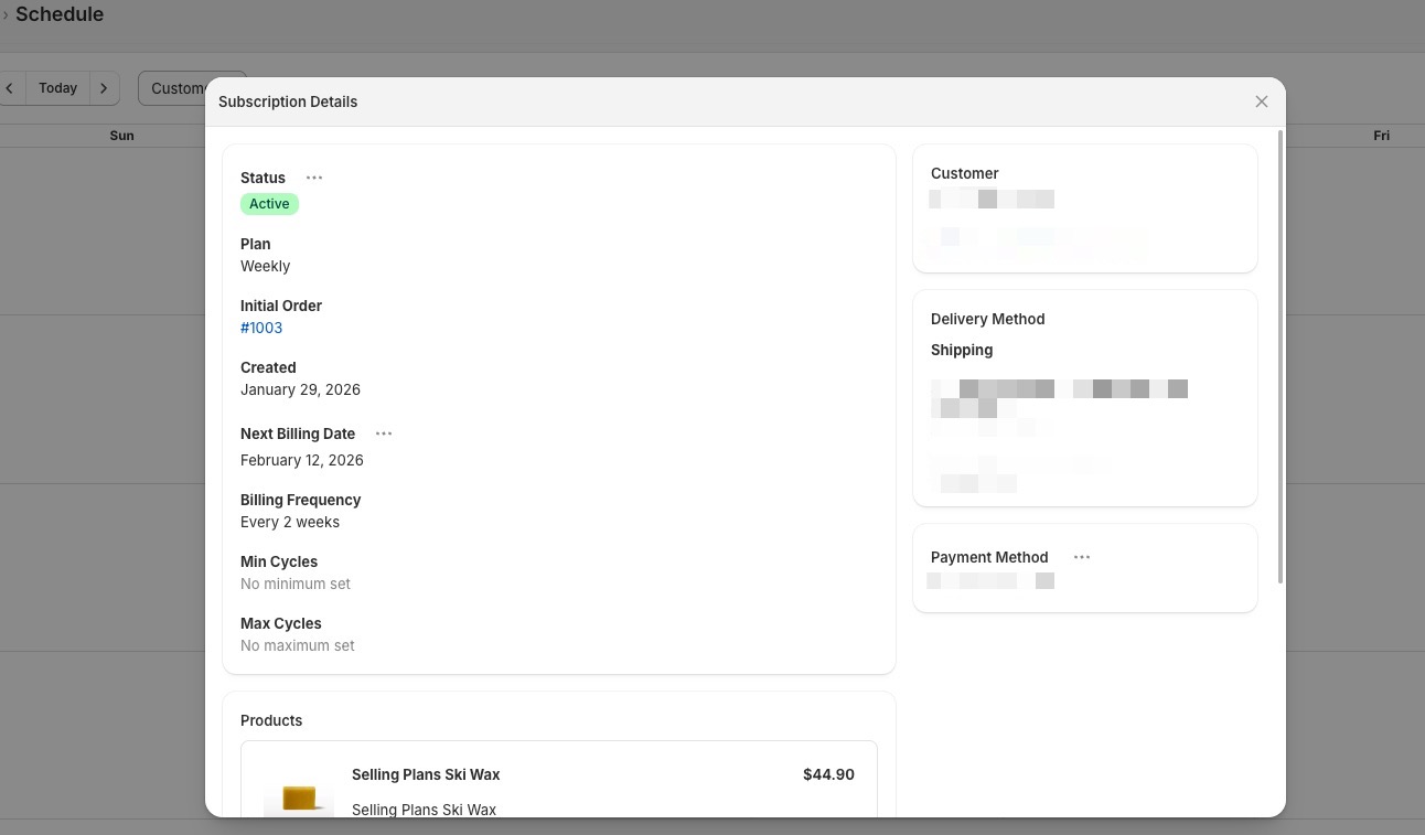The Schedule feature in Sip Subscriptions gives you a visual calendar view of all upcoming subscription activities — making it easy to stay on top of billing dates, renewals, and order processing.