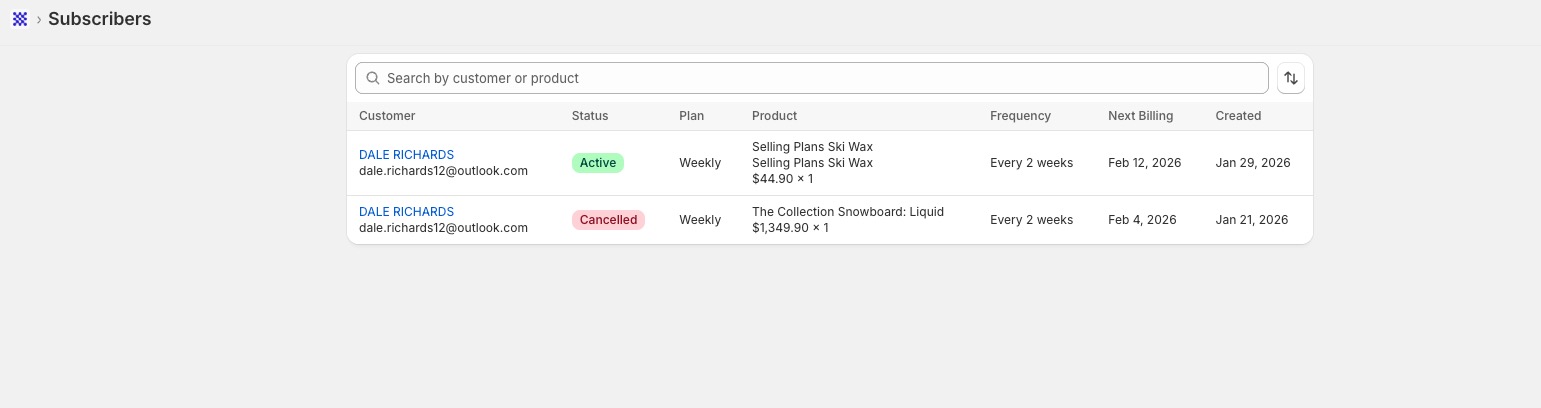 The Subscribers section in Sip Subscriptions gives you a quick overview of all customers with active or past subscriptions in your store. This view helps you manage your subscriber base, track subscription activity, and access detailed information for each customer.