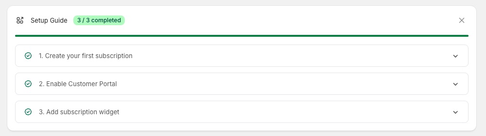 For new installations, the Setup Guide sits prominently on the home page to walk you through the three essential steps: creating a plan, enabling the portal, and adding the storefront widget.